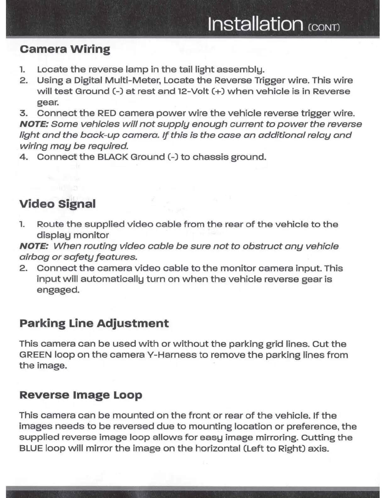 Voxx Electronics ACA800 - Camera Wiring Connection; Video Signal Connection; Parking Line Settings; Image Mirroring