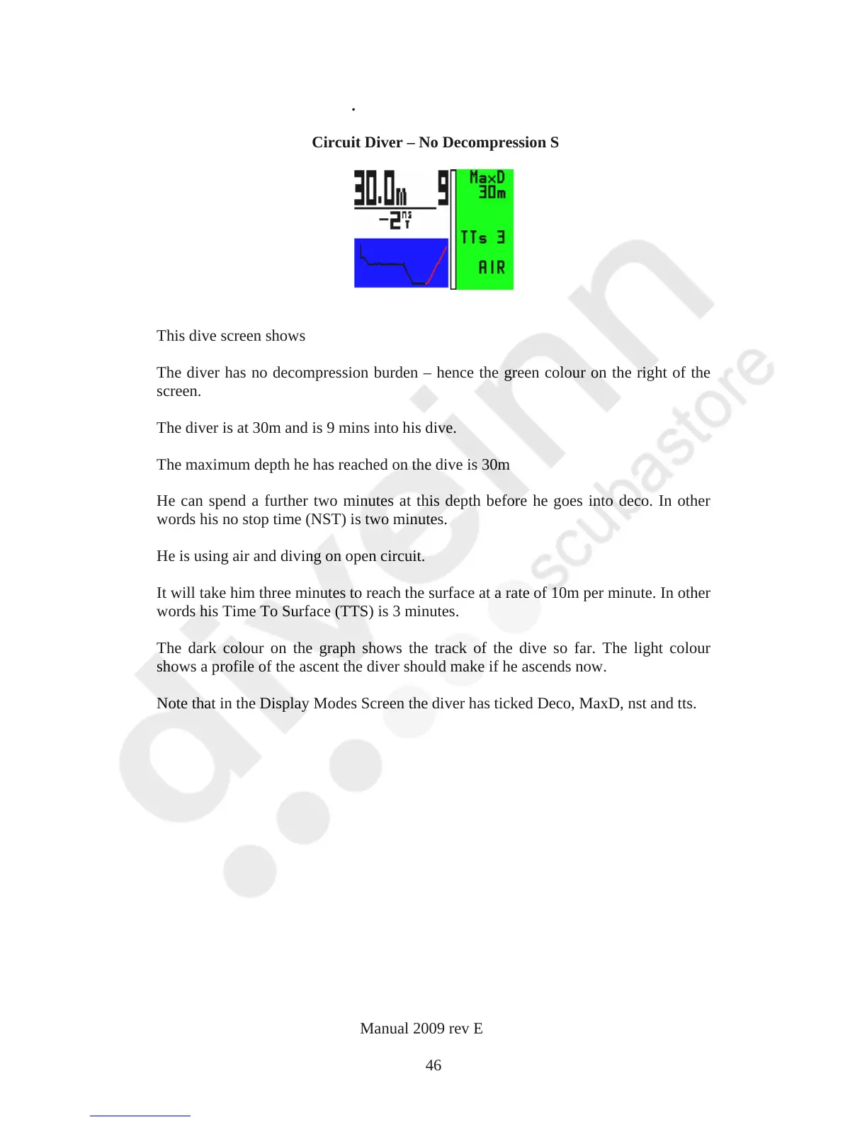 The diver is at 30m and is 9 mins into his dive.
