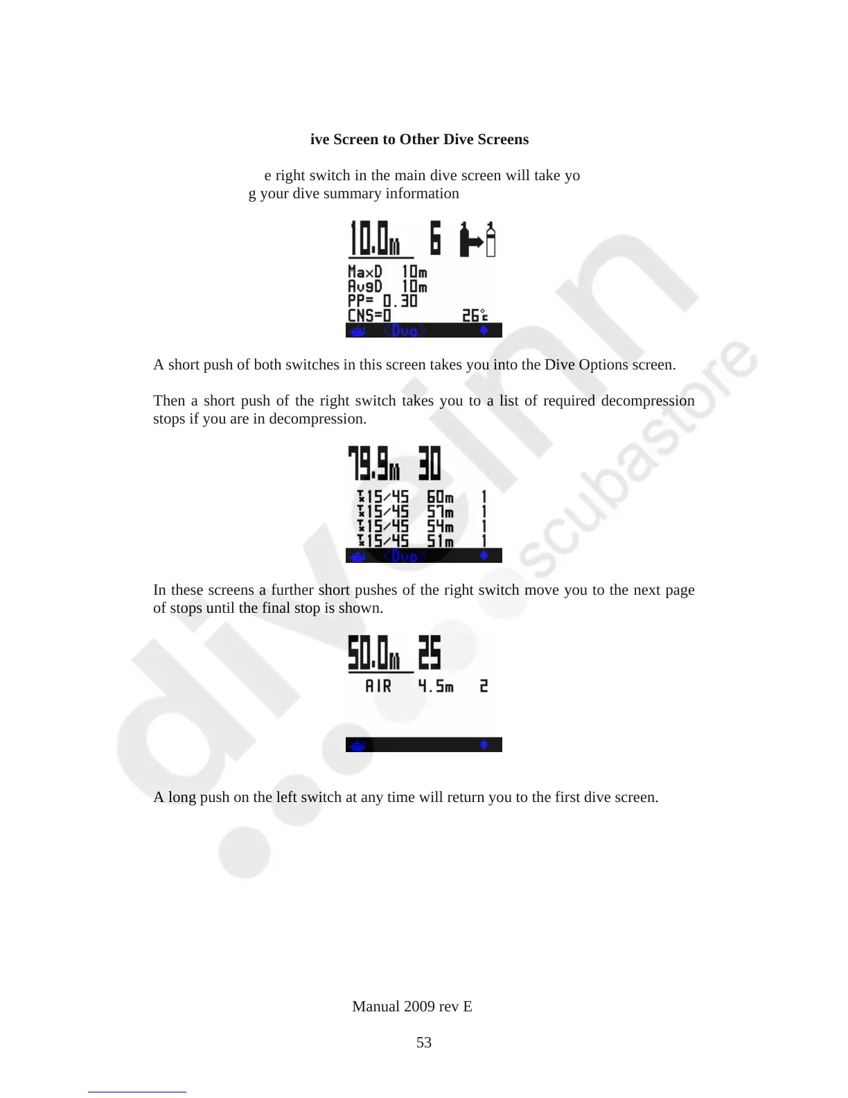 A long push on the left switch at any time will return you to the first dive screen.