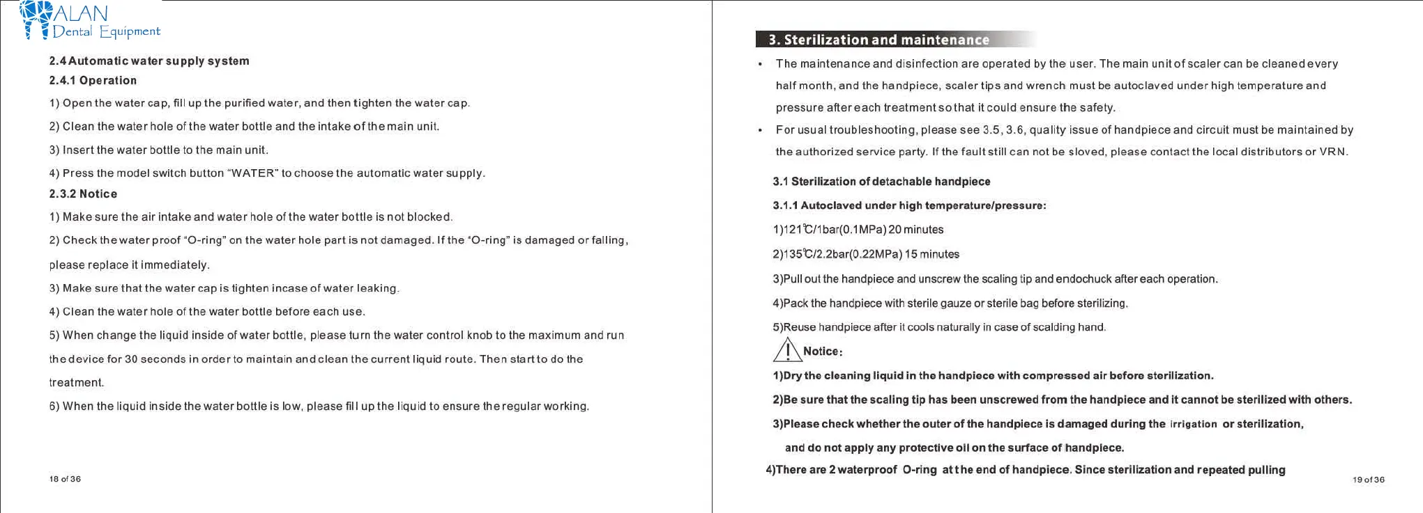 VRN A8 - 2.4 Automatic Water Supply System Operation; 3. Sterilization and Maintenance; 3.1 Sterilization of Detachable Handpiece