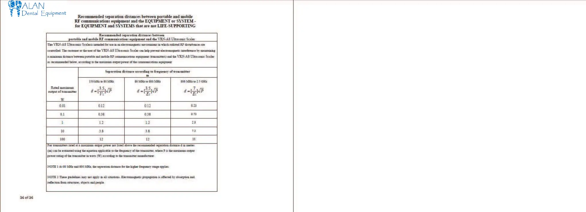 VRN A8 - Recommended Separation Distances for RF Communications Equipment