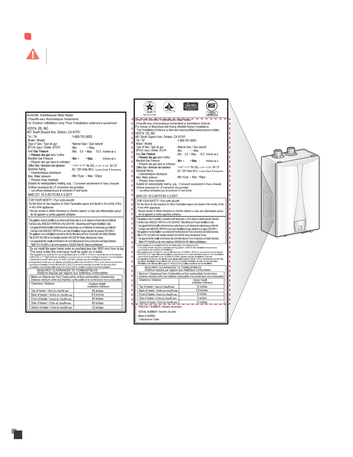 pressure, water pressure, and electrical supply available in the installation location. If the water heater does not match each of these ratings, do