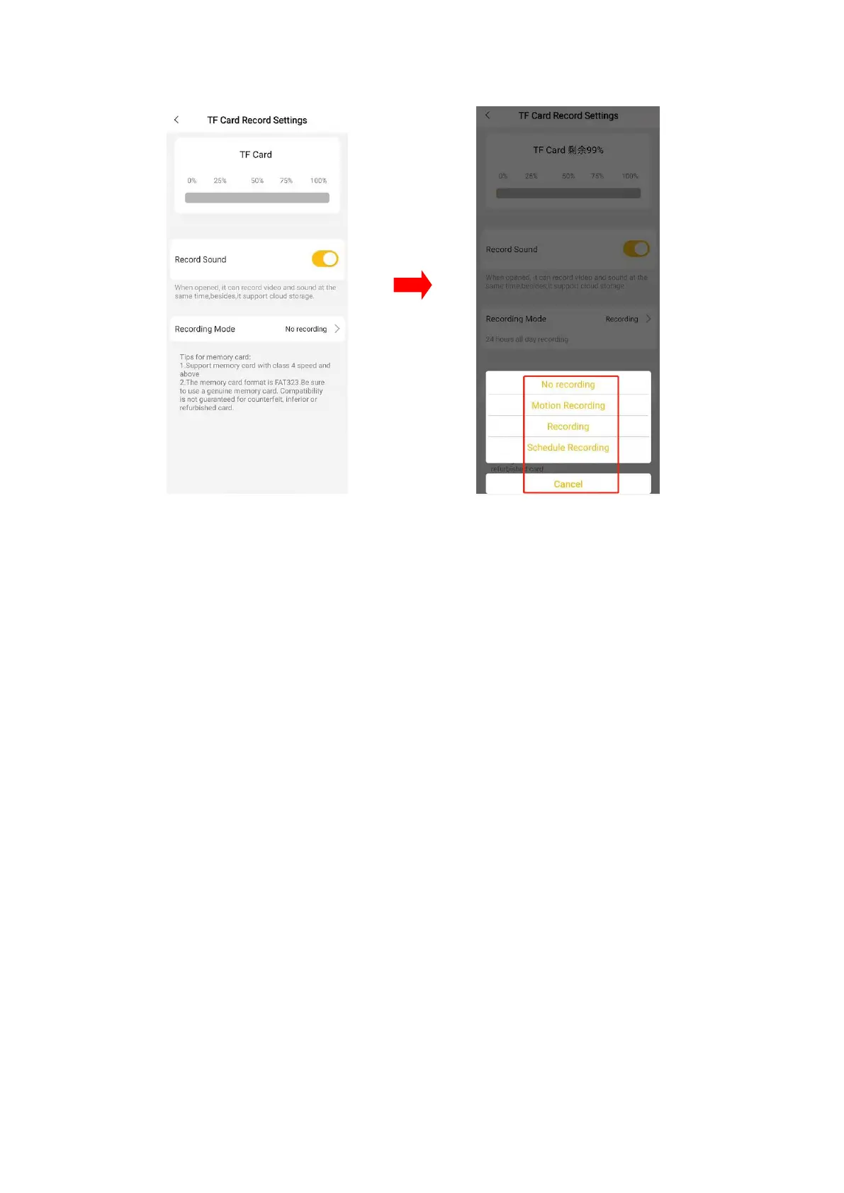 TF card recording mode can also be set here. There are modes of No recording, 24h