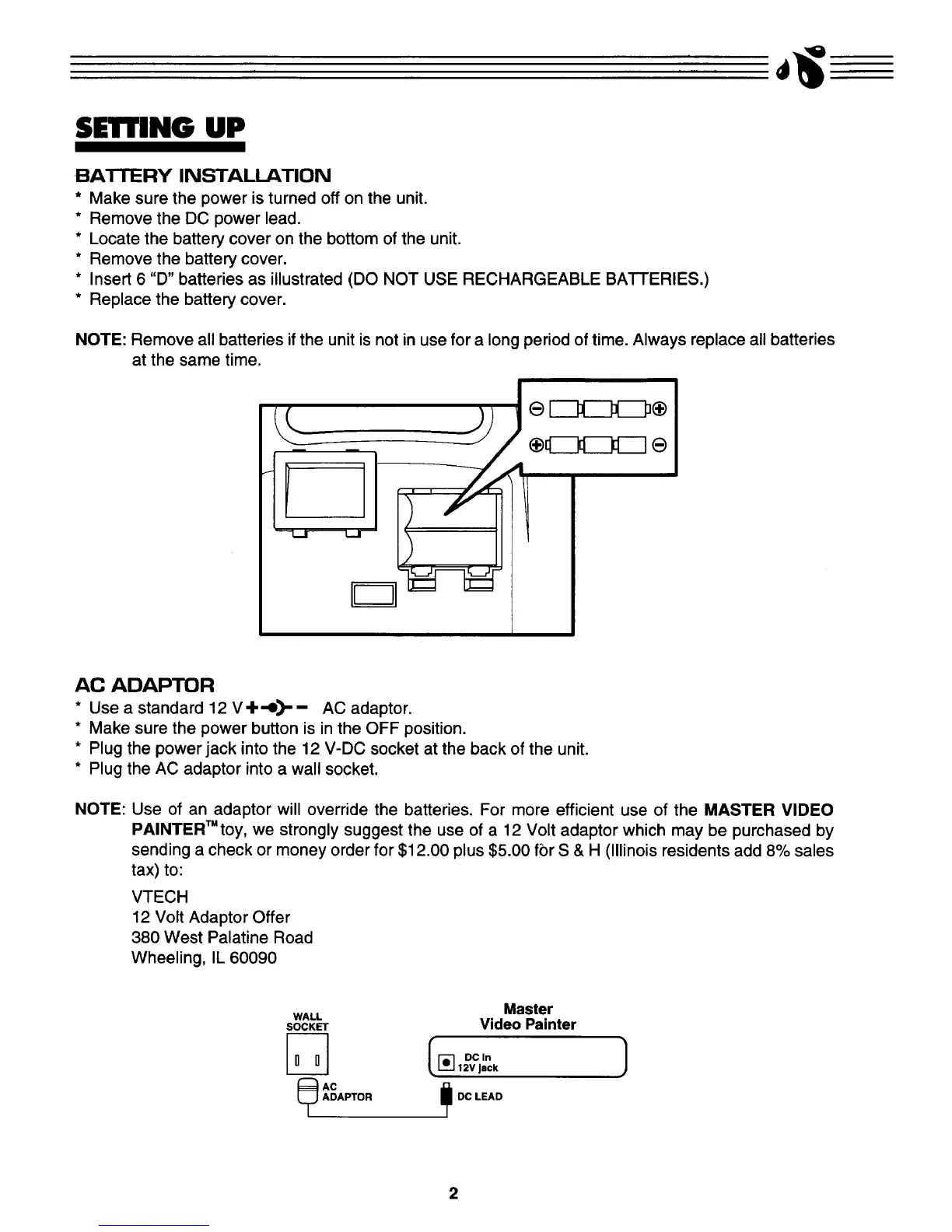 VTech Master Video Painter - Setting up; Battery Installation; AC Adaptor