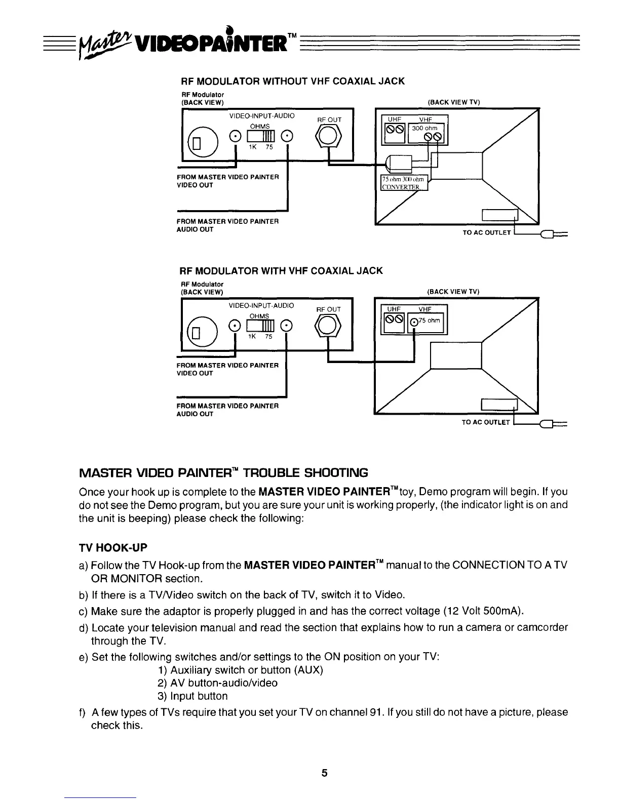 VTech Master Video Painter - RF Modulator Without VHF Coaxial Jack; RF Modulator with VHF Coaxial Jack; Troubleshooting; TV Hook-Up