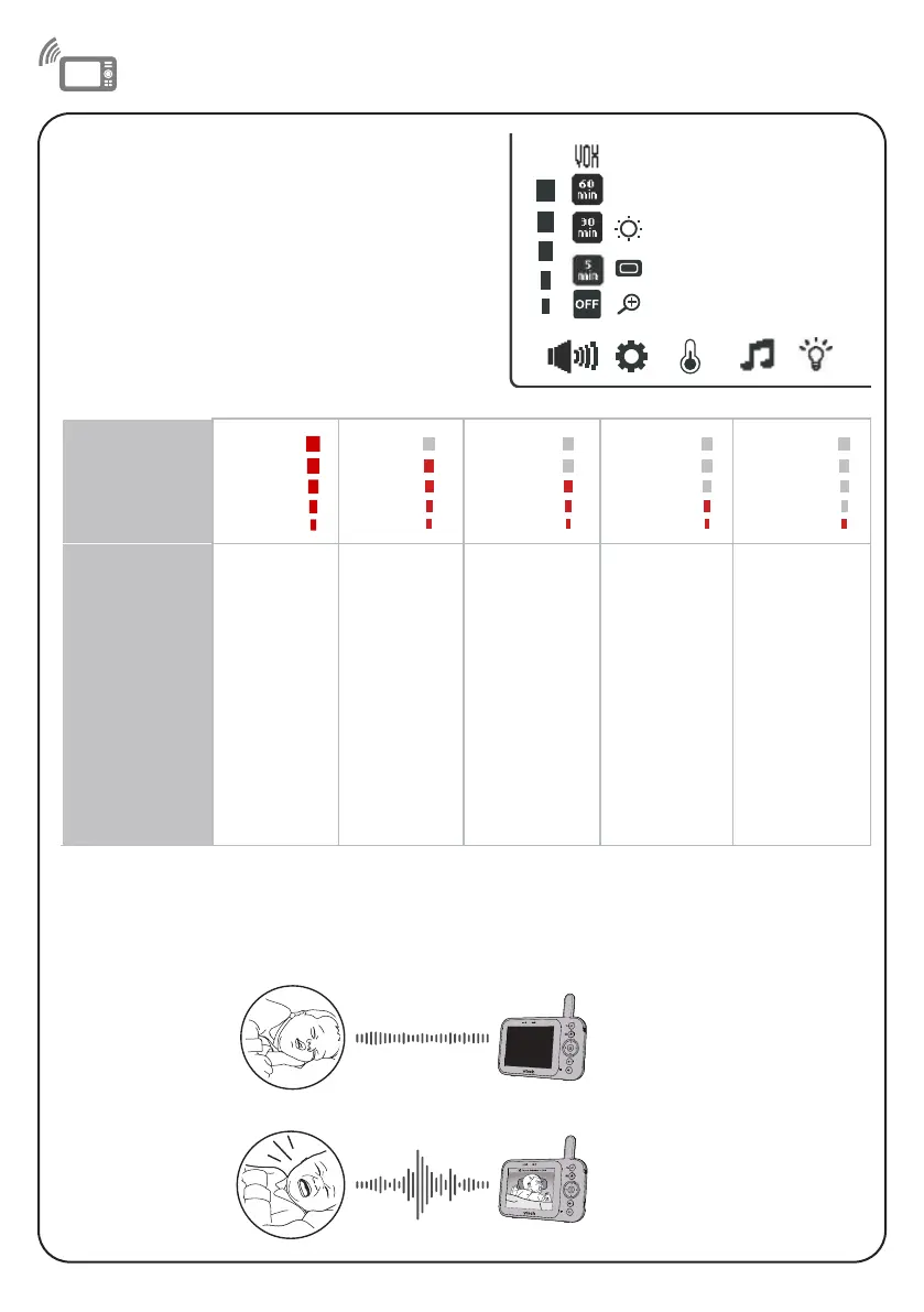 wenn die Babyeinheit Geräusche erkennt, die unter dem eingestellten Pegel liegen. Sobald die