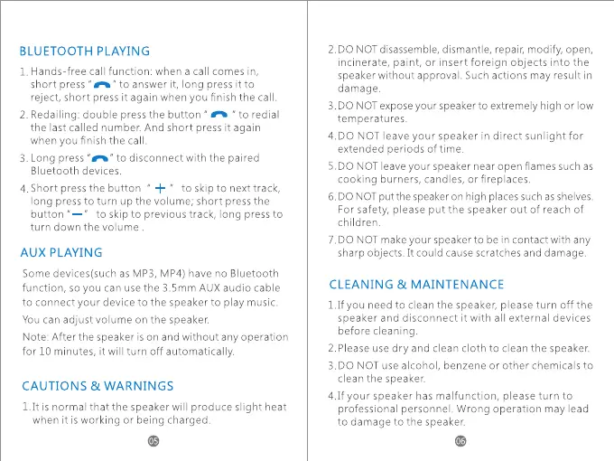 Vtin Punker - Bluetooth Playing Functions; Hands-Free Call Operation; Music Playback Controls; AUX Playing Mode