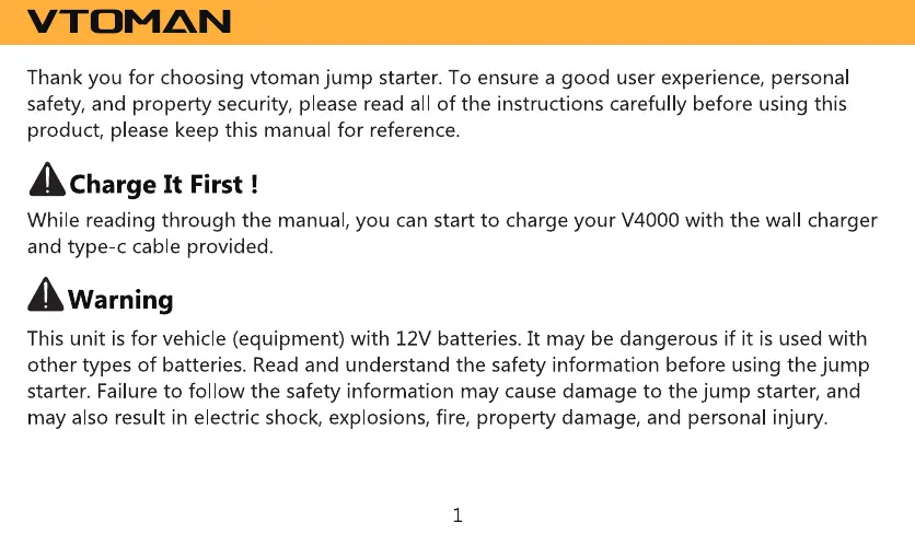 VTOMAN V4000 - Introduction and Safety Advice; Charge It First!; Important Warning
