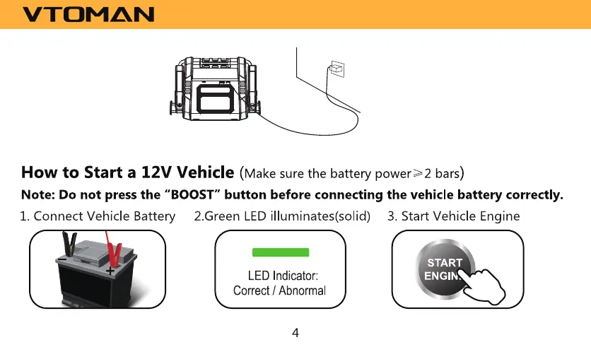 VTOMAN V4000 - How to Start a 12 V Vehicle