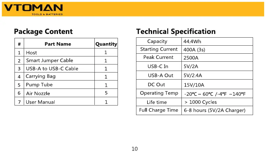 VTOMAN X1 - Package Contents and Specifications; Included Package Items; Technical Specifications