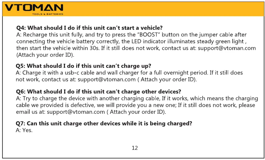 VTOMAN X1 - Troubleshooting Vehicle Start Failure; Troubleshooting Charging Issues; Clarification on Charging While Charging