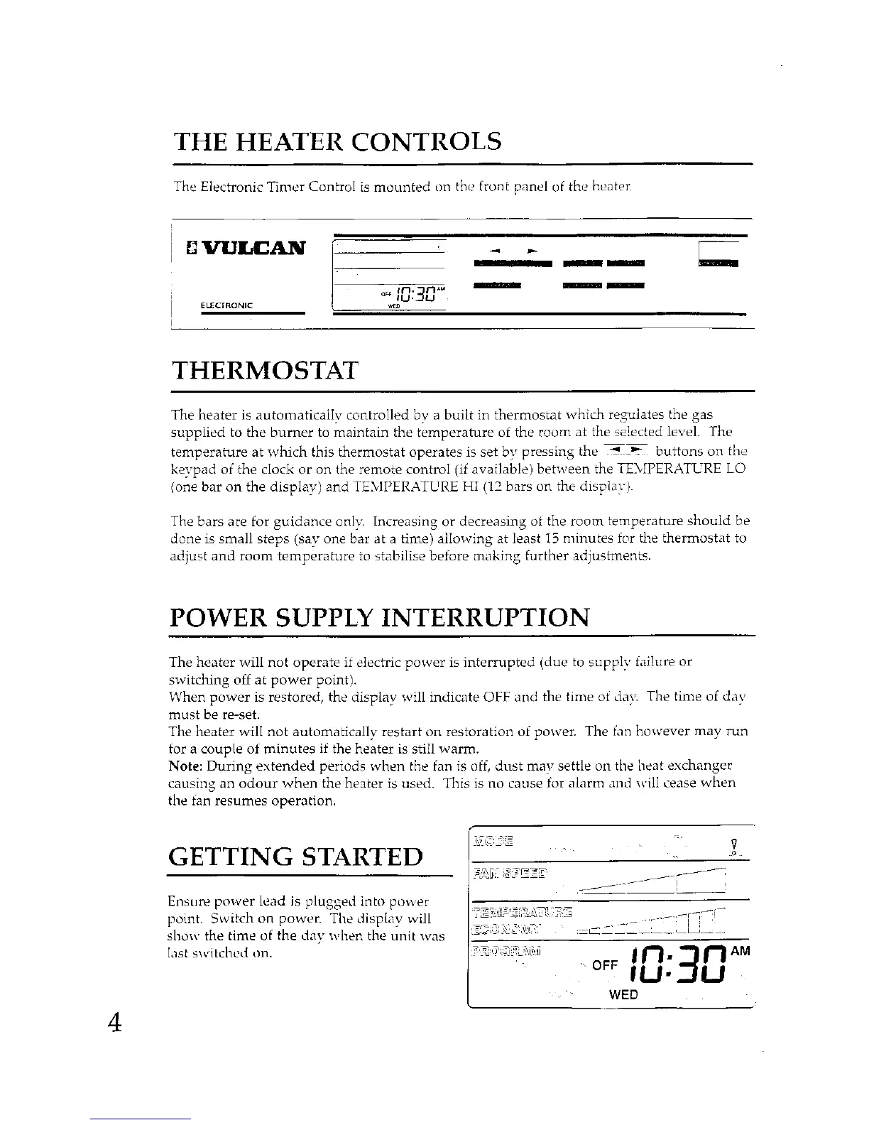 Vulcan Heating Silhouette - Heater Control Panel and Basic Operation; Thermostat Functionality; Power Interruption Handling; Initial Setup Procedures