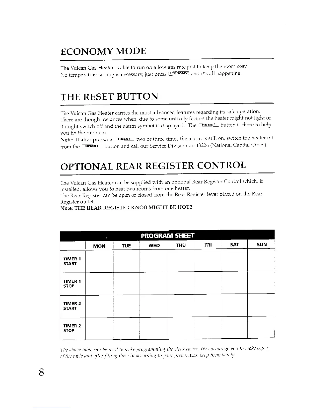 Vulcan Heating Silhouette - Economy Mode, Reset, and Optional Controls; Economy Mode Operation; Using the Reset Button; Optional Rear Register Control