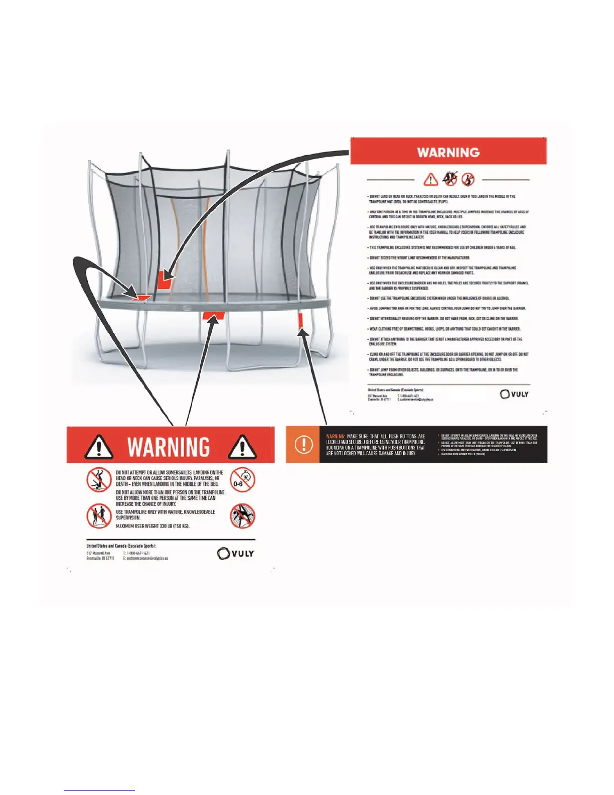 The labels shown on this page have been attached to the trampoline in the indicated locations. The safety instructions placard will
