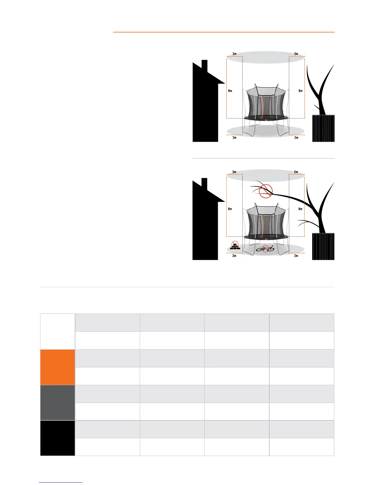 • Maintain a minimum clearance of 2 m on all sides of the trampoline.