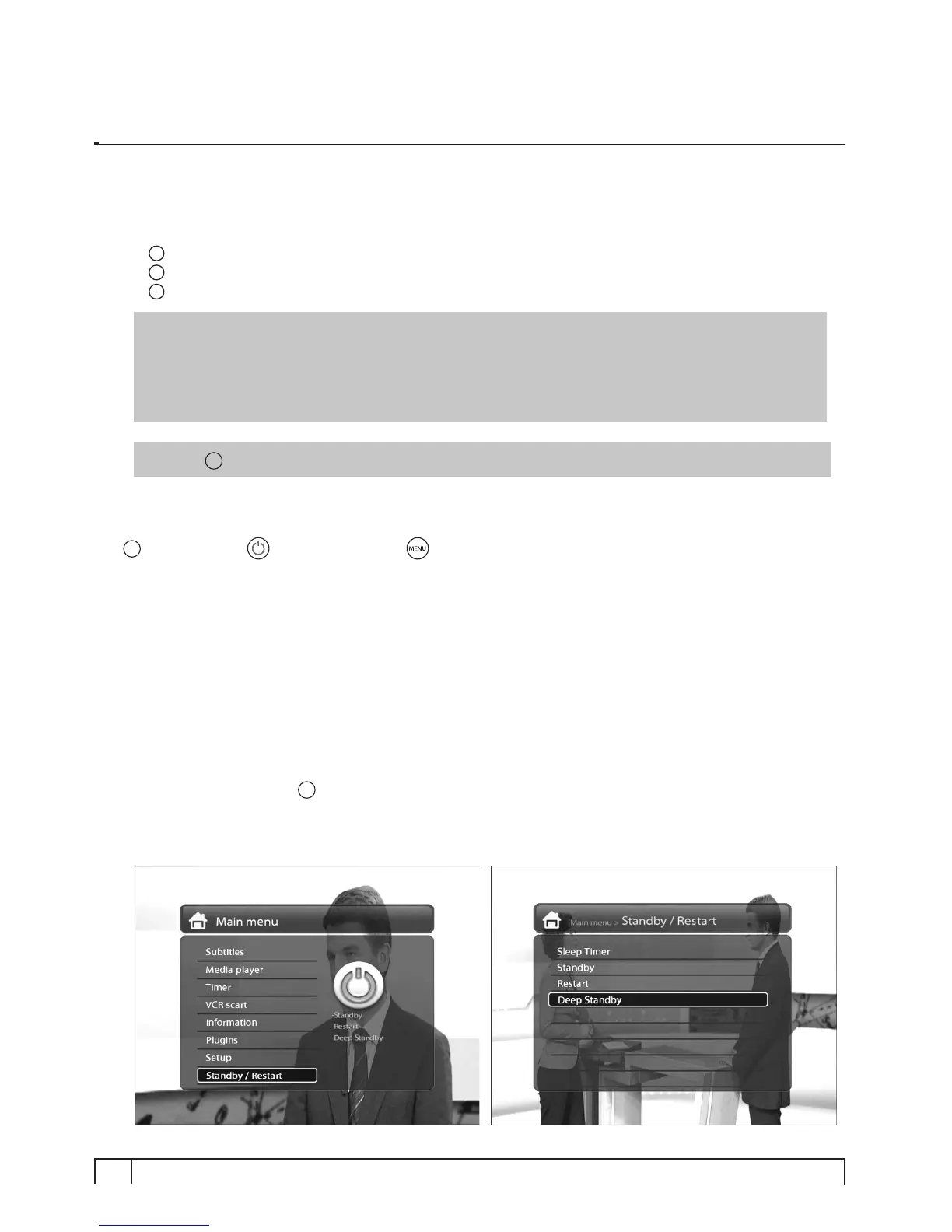 : Menu > Standby/Restart > Deep Standby]