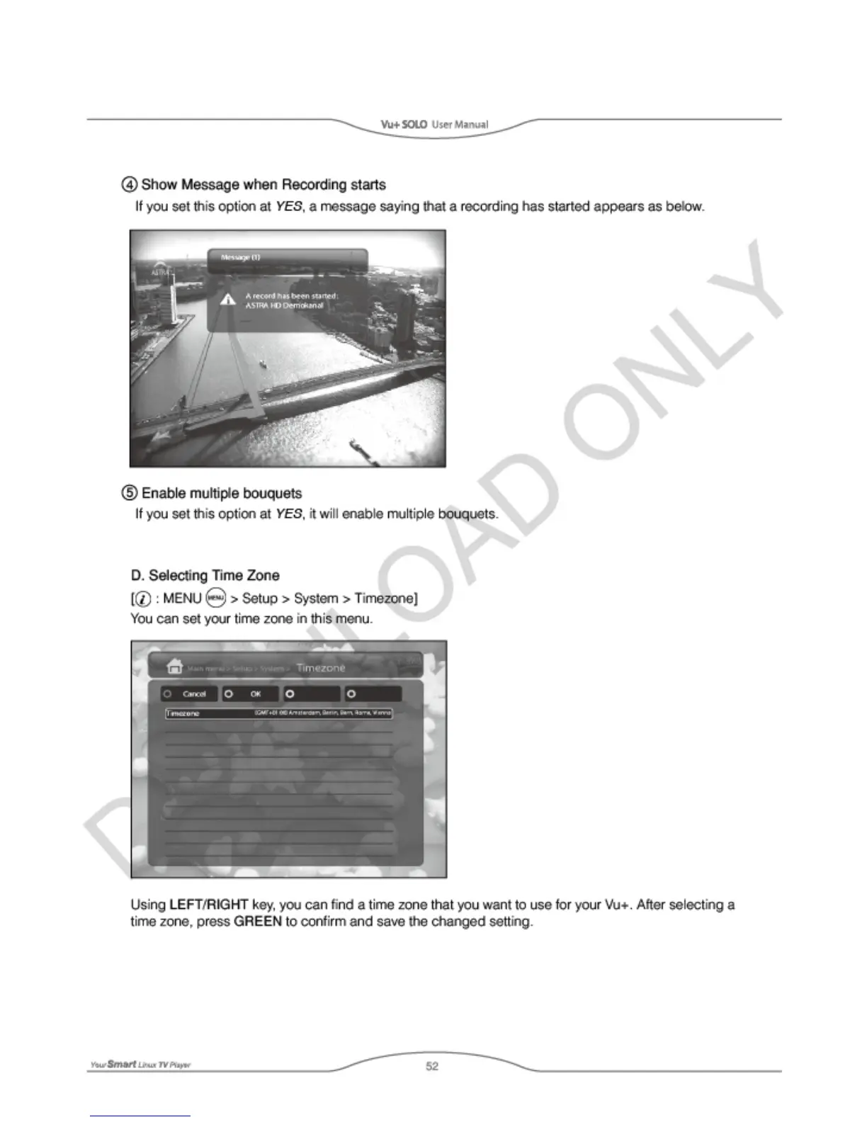 Vu+ SOLO - Selecting Time Zone; Show Message When Recording Starts; Enable Multiple Bouquets