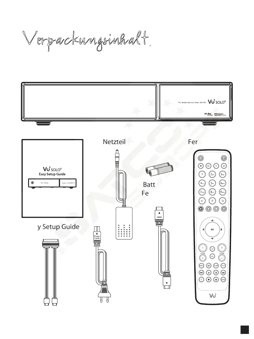 Vu+ Solo2 - Package Contents; Easy Setup Guide; Power Adapter; Remote Control (RCU)