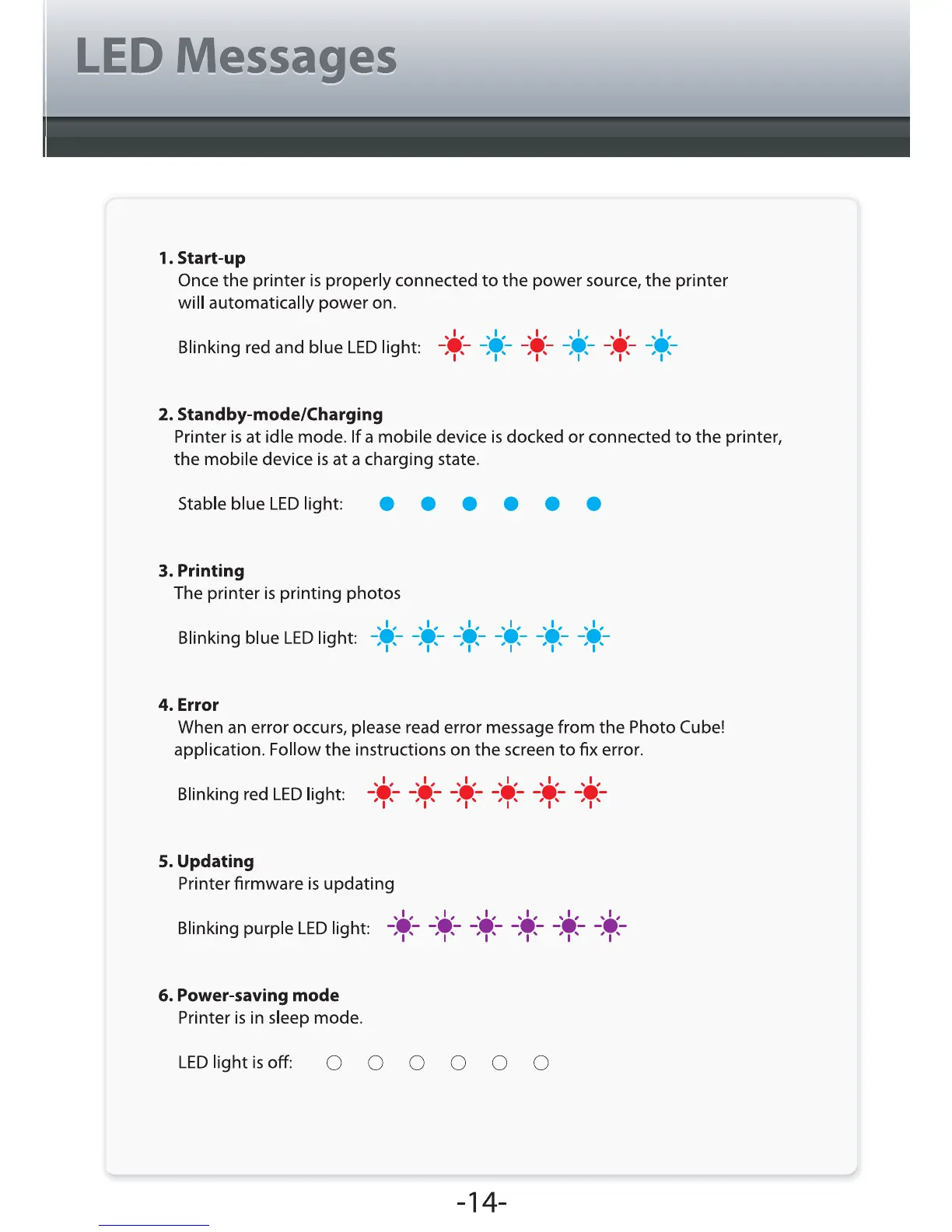 VuPoint IP-P10-VP - LED Messages and Status Indicators; Start-up; Standby-mode;Charging; Printing