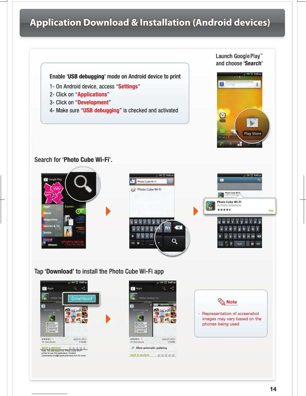 VuPoint IPWF-P30-VP - Application Download and Installation (Android Devices); Enable USB Debugging; Search for App on Google Play; Install Photo Cube Wi-Fi App