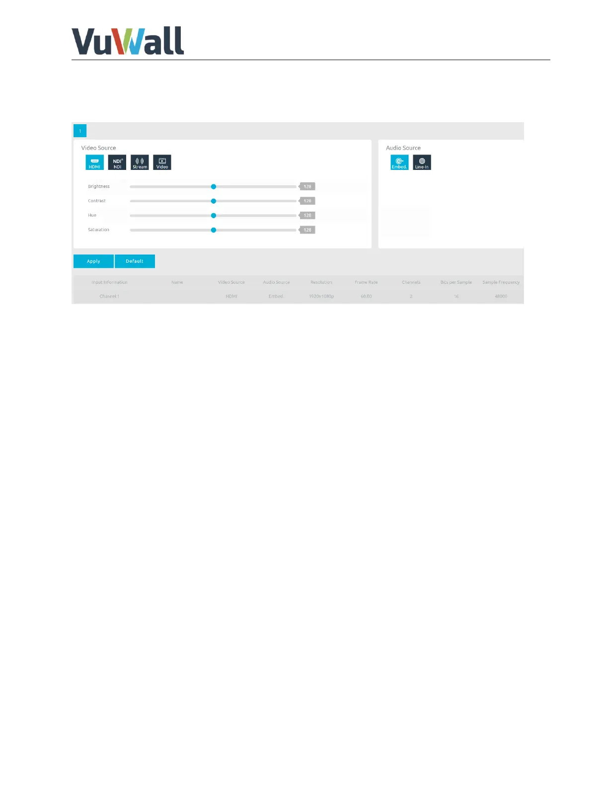 This page contains input signal status, input Video Source and Audio Source selection. Users can change