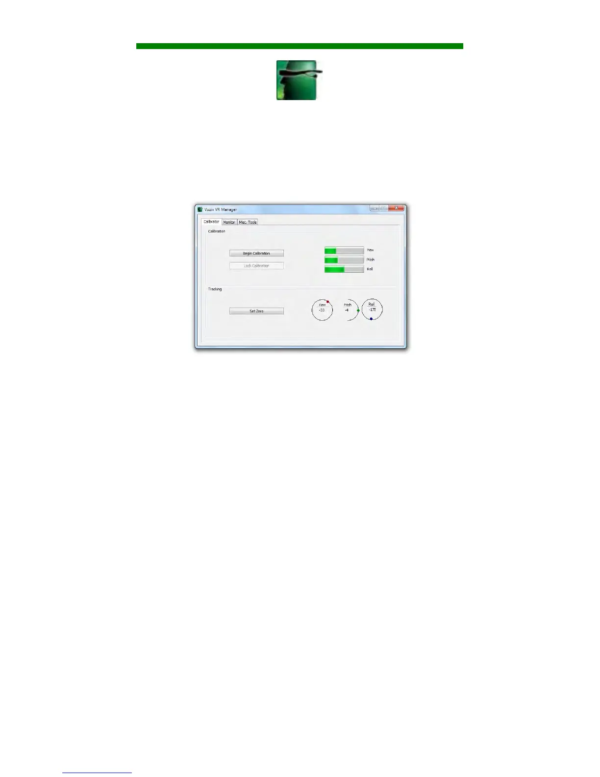 The VR Manager’s interface is divided into three sections, Calibrator, Monitor, and