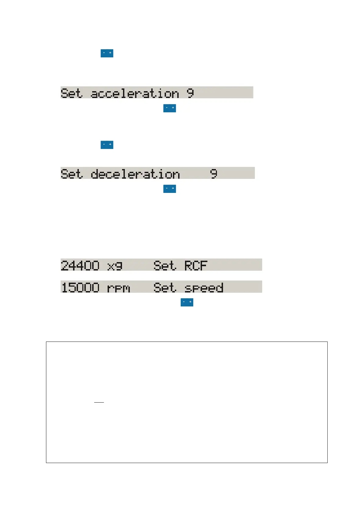 The display shows the "RPM“ or the "RCF"-value depending on the display setting. Press the
