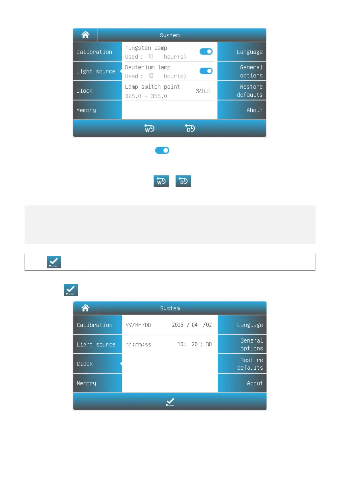 Press the icon to turn on/off the Tungsten lamp/Deuterium lamp.