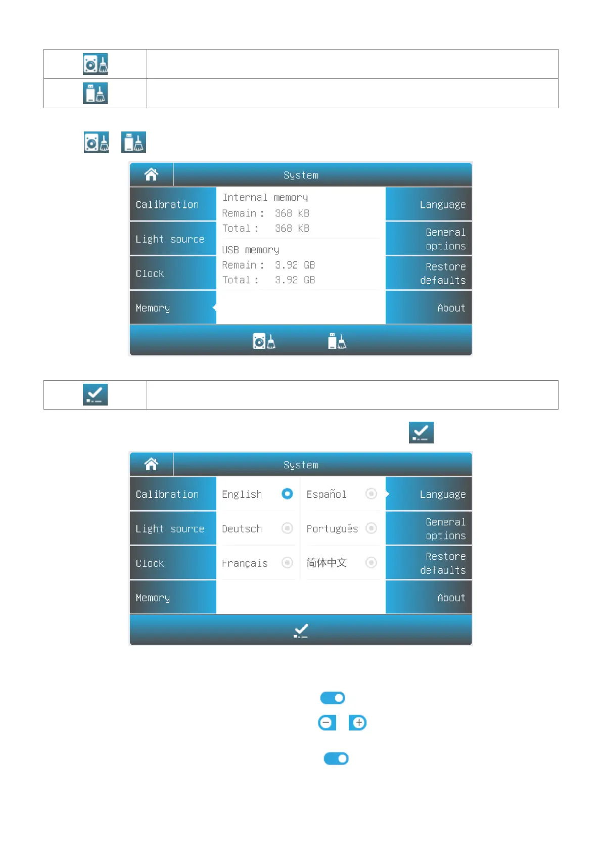 Select Tab Memory in the System interface. The use of the internal and USB memory (If inserted) are show. Press