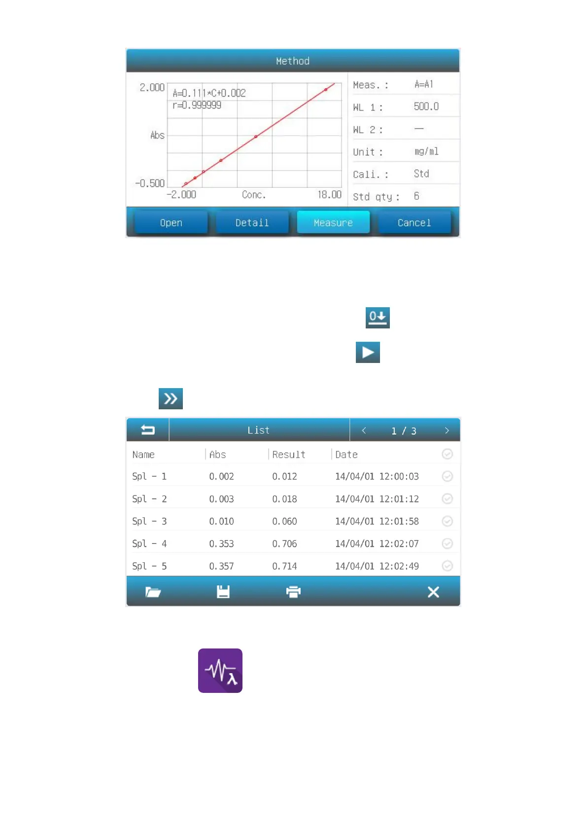 3.6 Put the sample in the measurement channel, press the icon to measure a sample and record the