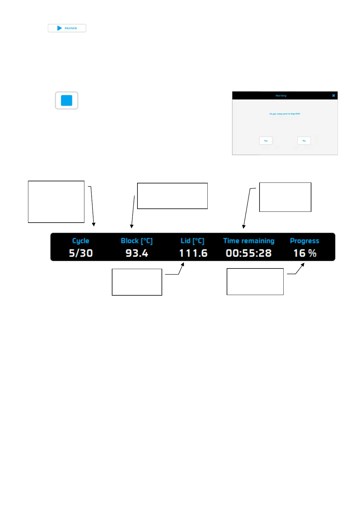 In this window the following information on the status is shown during a run: