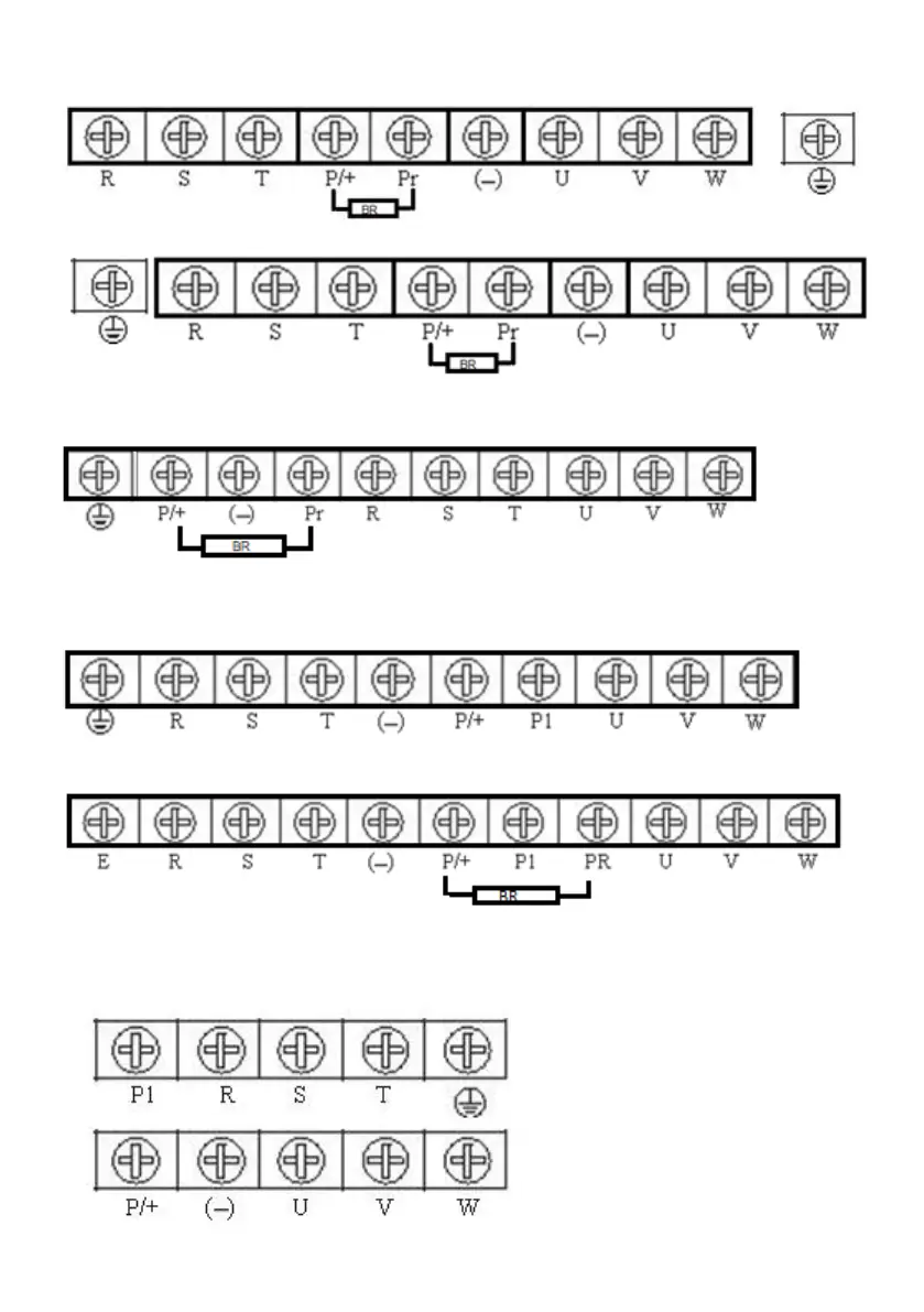 c./ Main terminal block for types powered by 3 x 400 V (690 V), 11 to 15kW with BR.