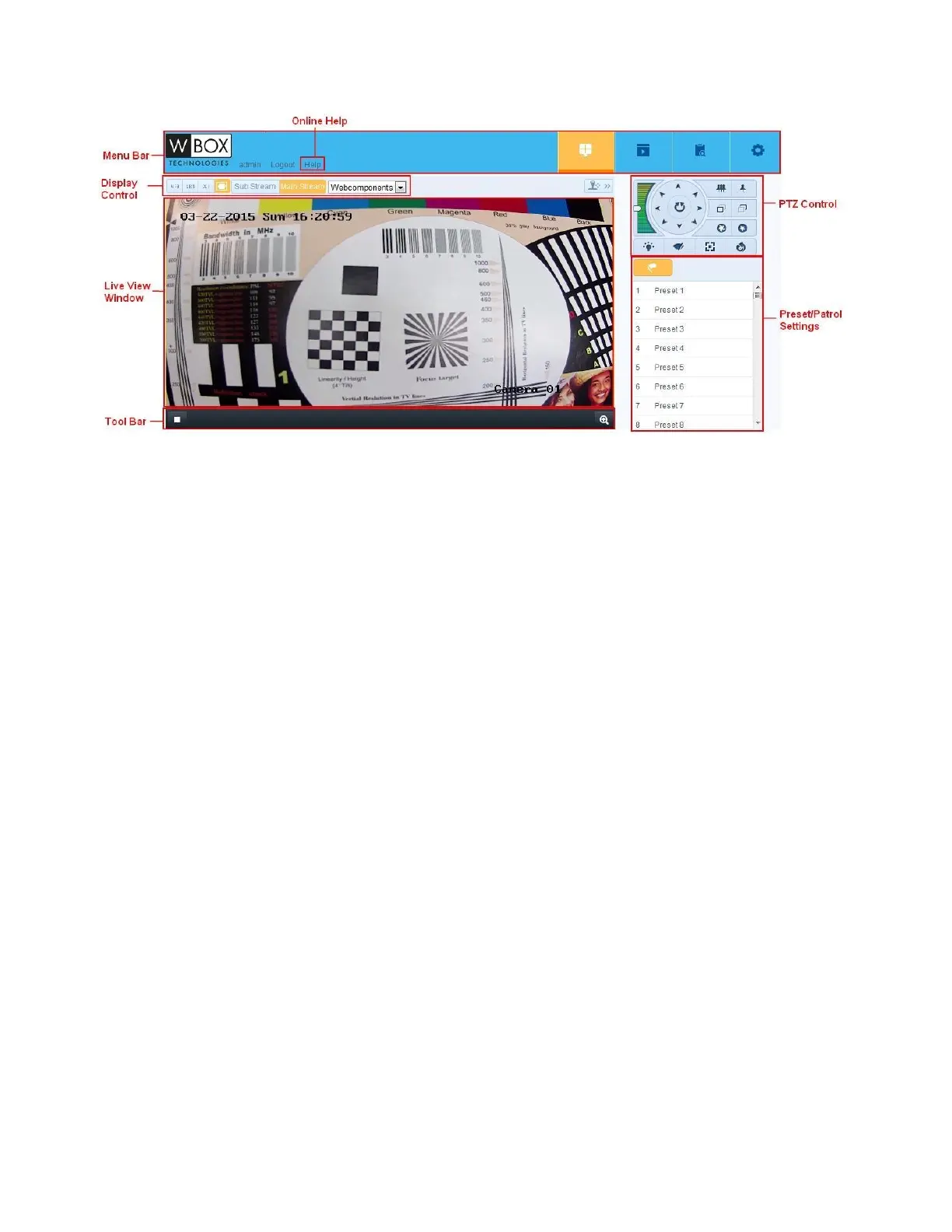 Kliknutím na jednotlivé karty přejdete na stránku živého náhledu, přehrávání, protokolu a konfigurace.