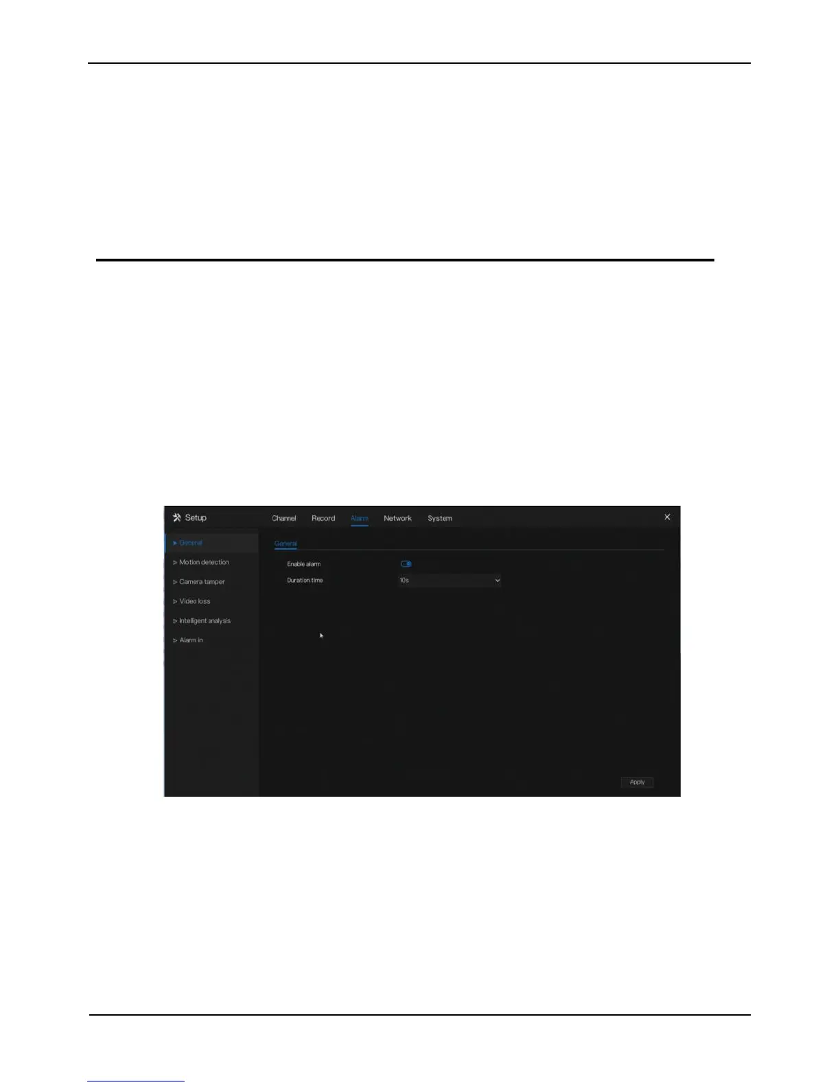 Set the general alarm information, motion detection, camera tamper, video loss, alarm