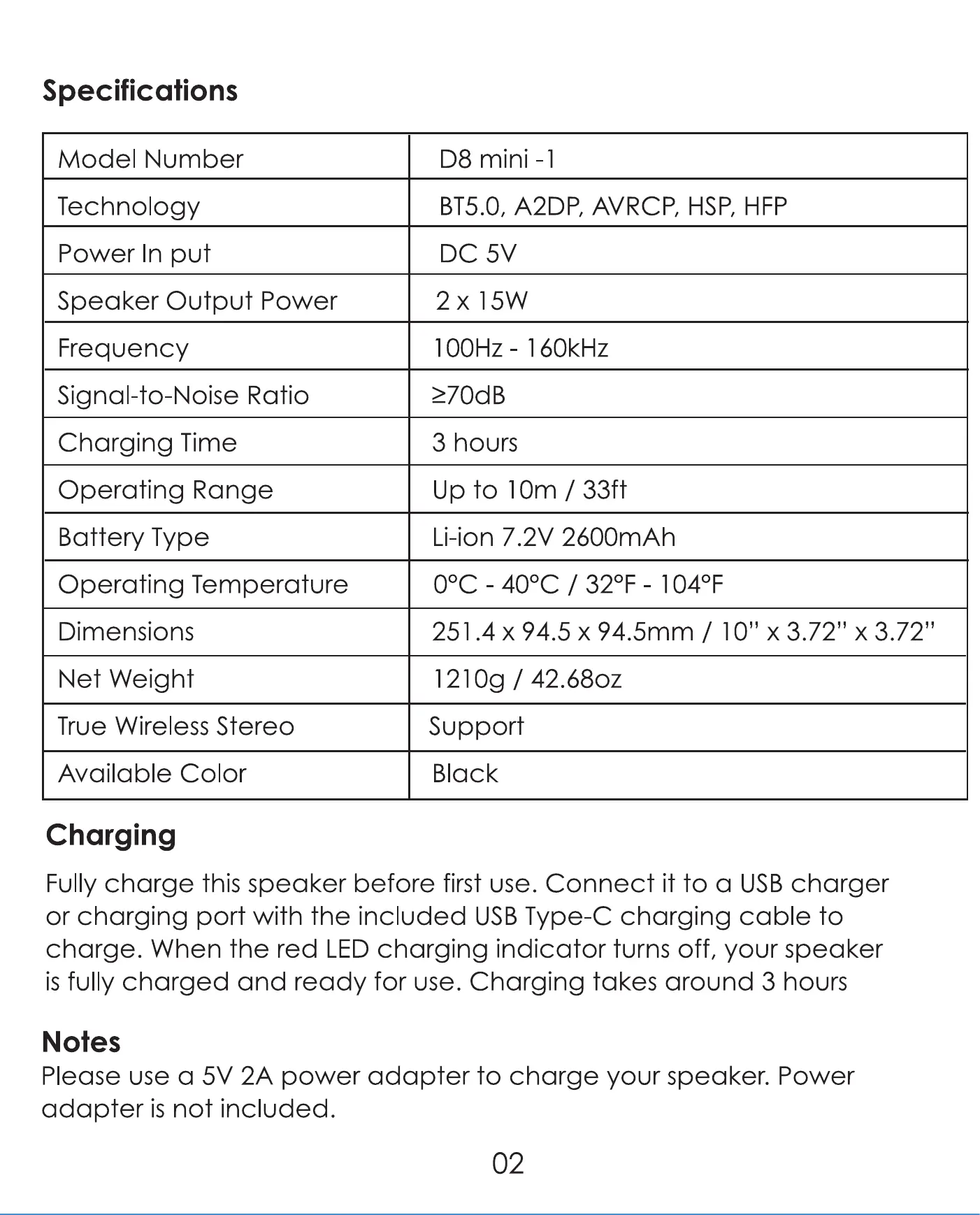 Fully charge this speaker before first Use. Connect it to a USBcharger
