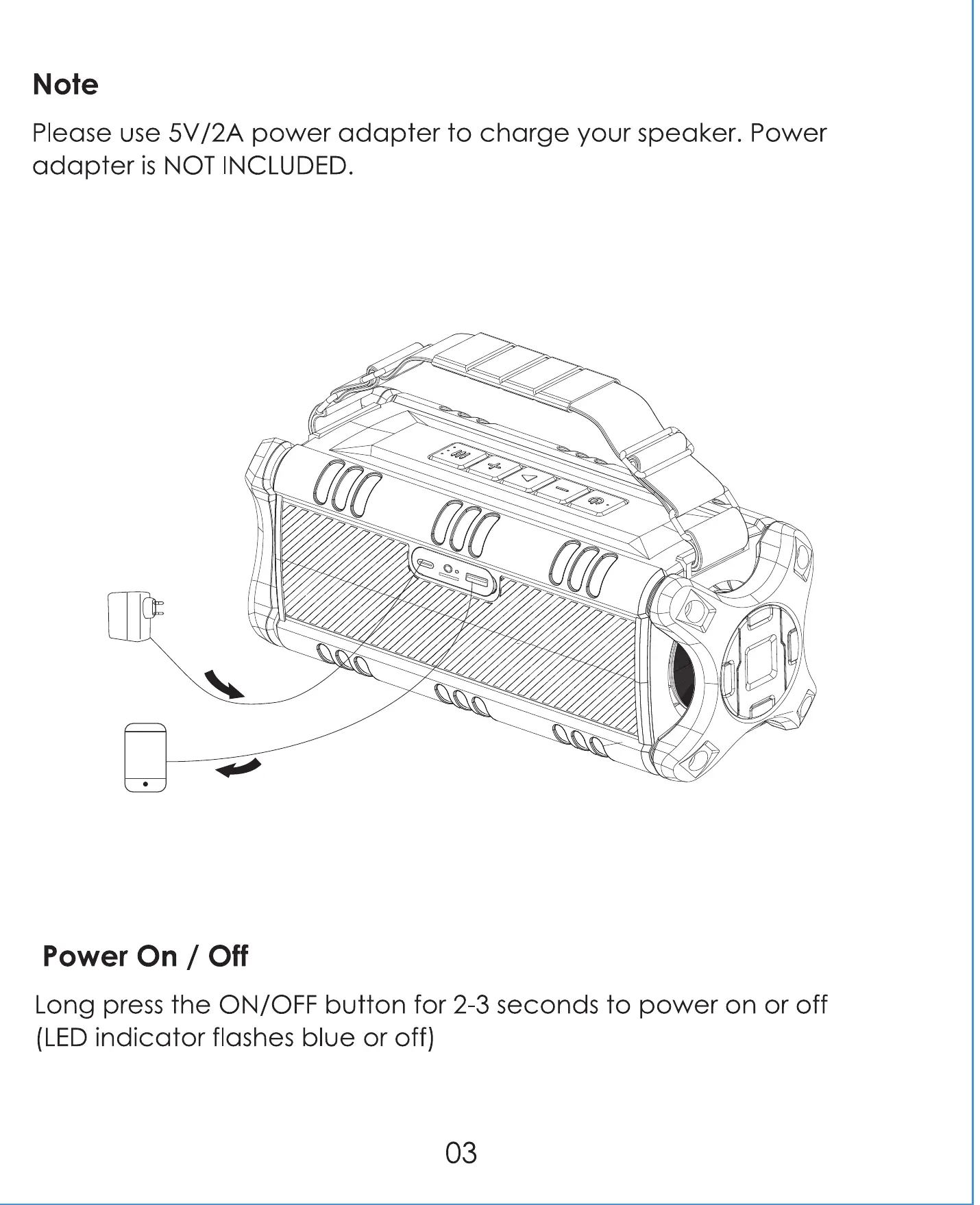 Please use 5V/2A power adapter to charge your speaker. Power