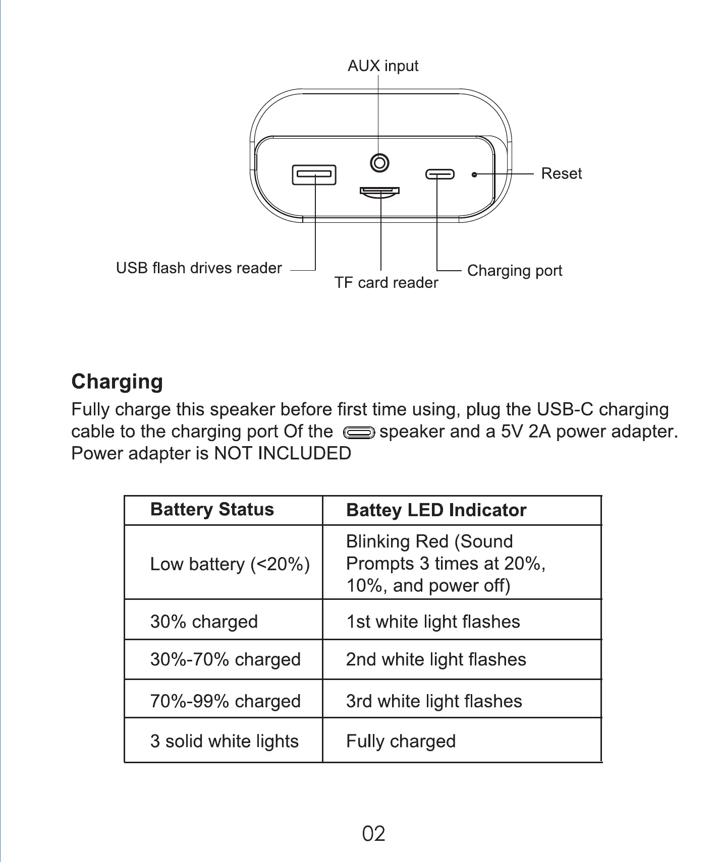 cable to the charging port Of the —speaker and a 5V 2A power adapter.