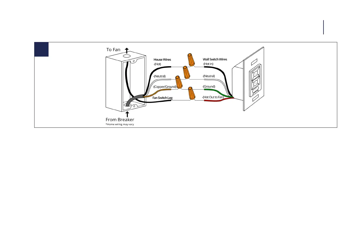 1. Connect the green wire marked “GROUND” from the wall control to the copper wire from the wall outlet box that