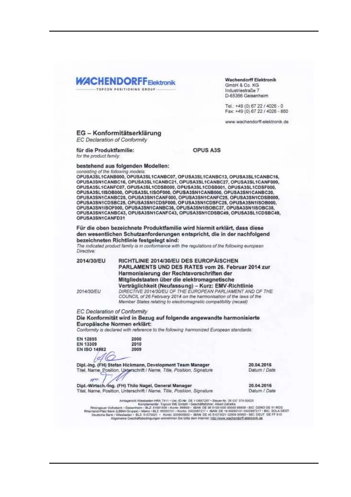Wachendorff OPUS A3 - Declaration of Conformity for OPUS A3 STANDARD