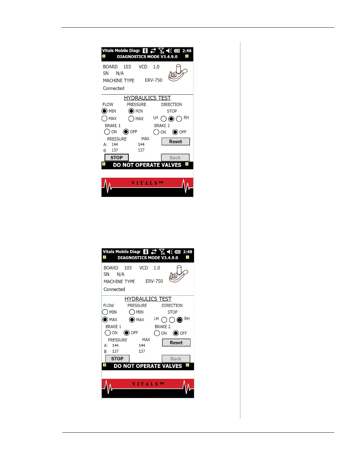 To exit the hydraulics test, tap the Back button.