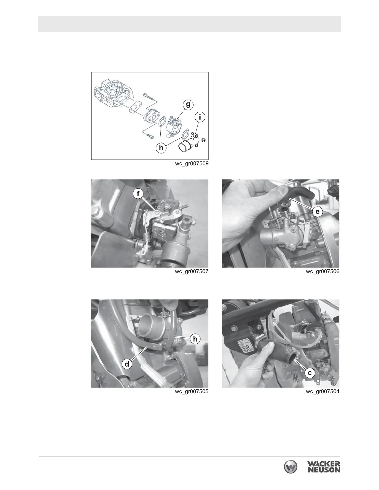 4.23.1 Install the carburetor (g), gaskets (h), and adapter (i).