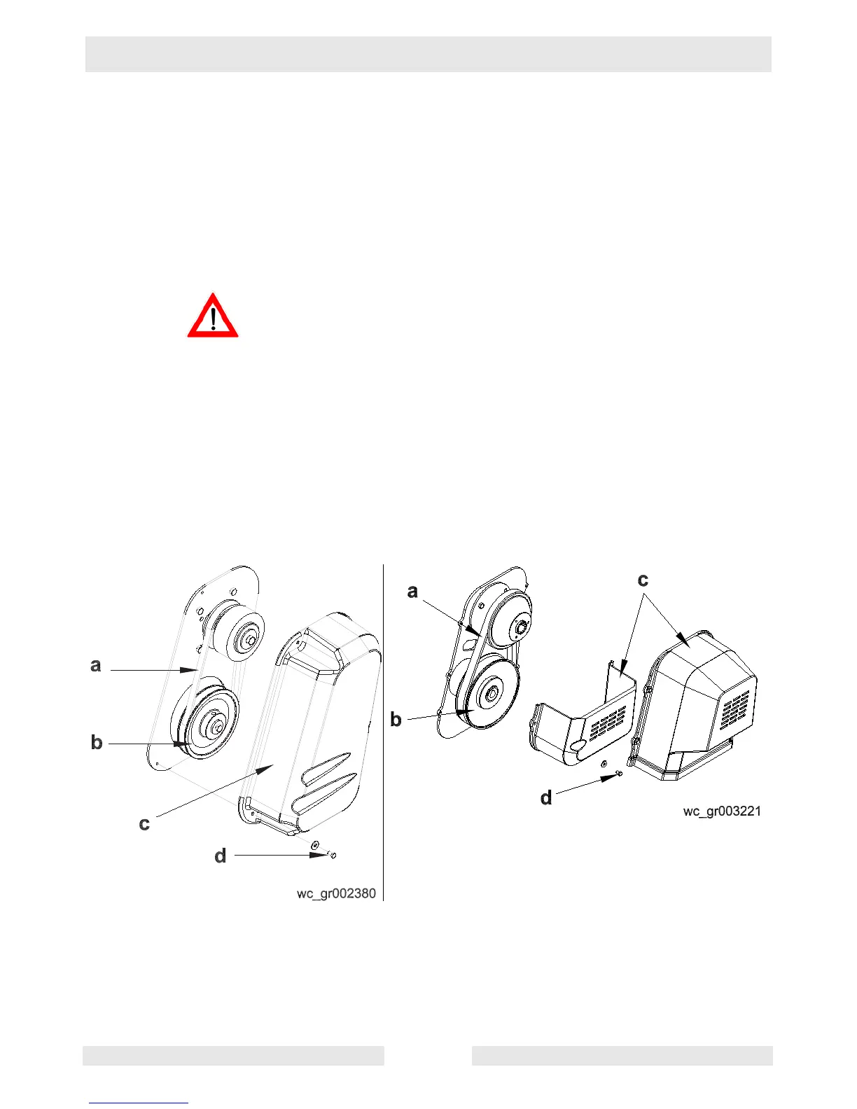 4.12.2 Loosen the screws (d) and remove the belt guard (c).