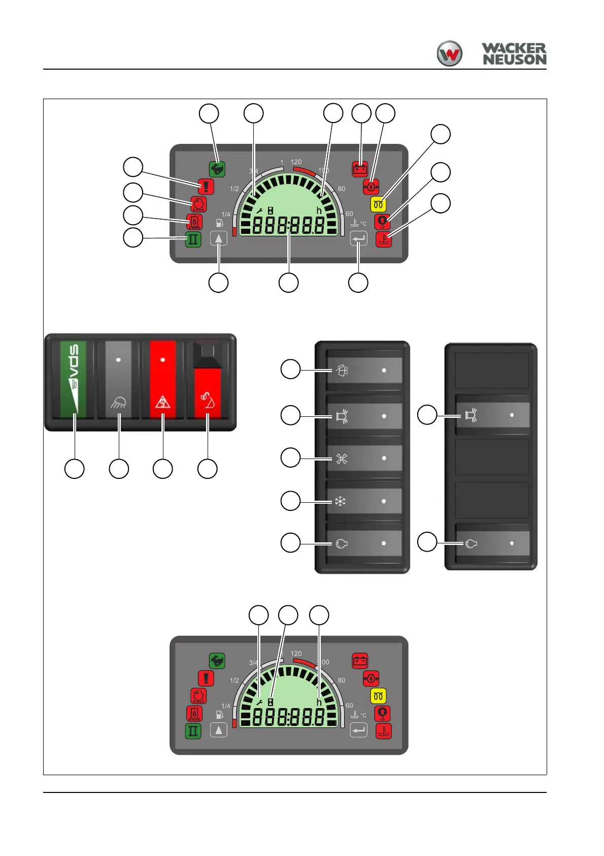 Wacker Neuson EZ38 - Display Element and Switches; Switch Panel on Left-Hand Control Lever Base; Right Switch Panel (Cabin); Right Switch Panel (Canopy)