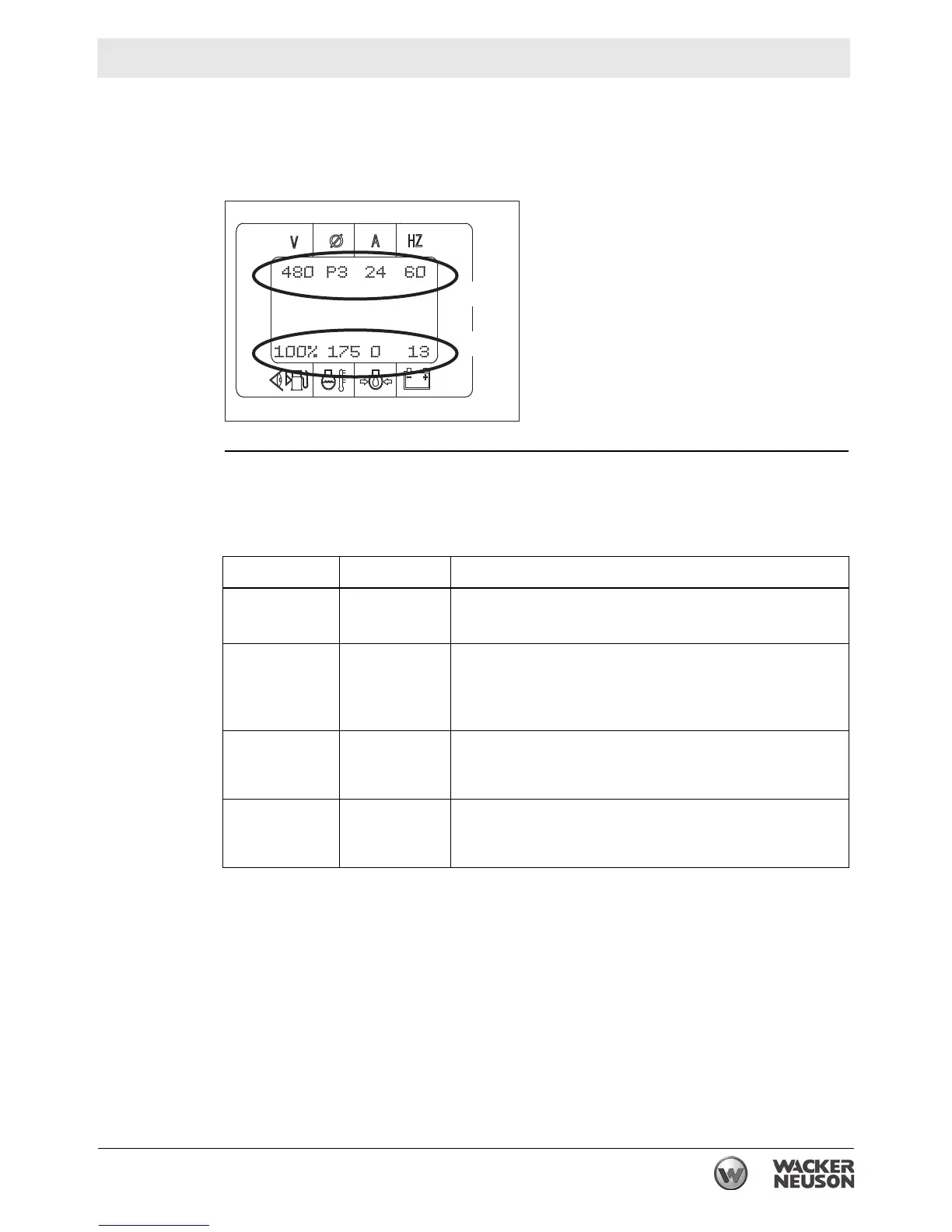 The upper line of the LCD panel shows the voltage, phase, amperage, and