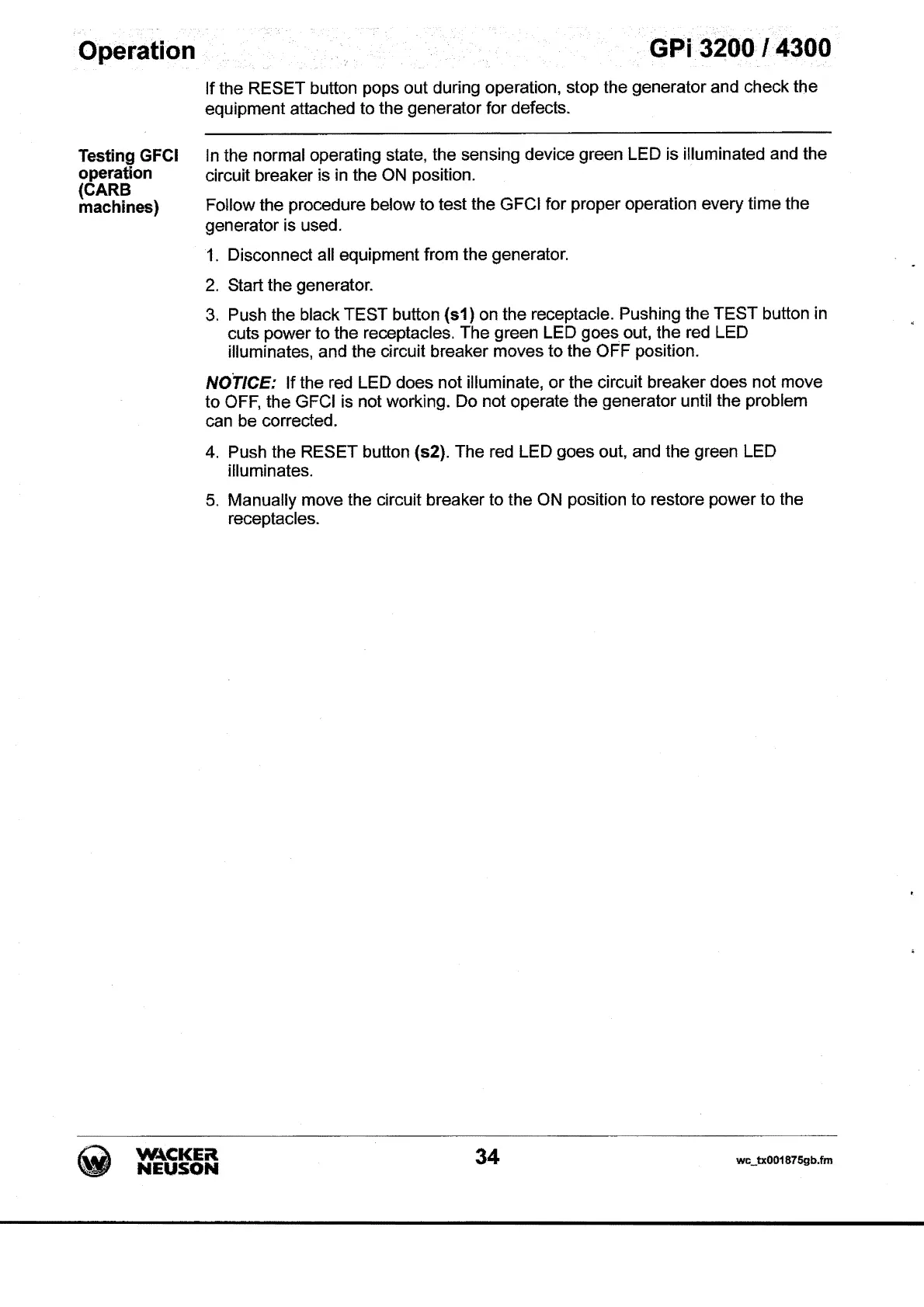 OFF, the GFCI is not working. Do not operate the generator until the problem