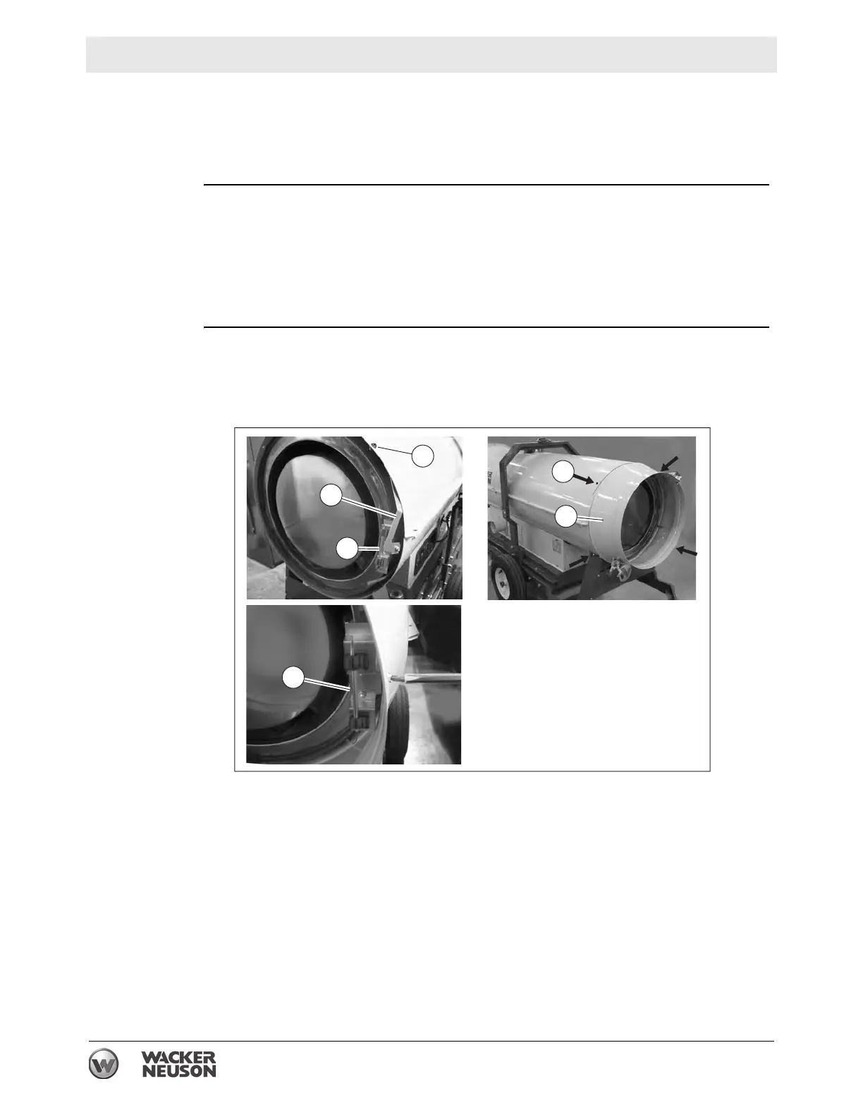 4. Align the four threaded mounting holes (e) on the duct adapter with the