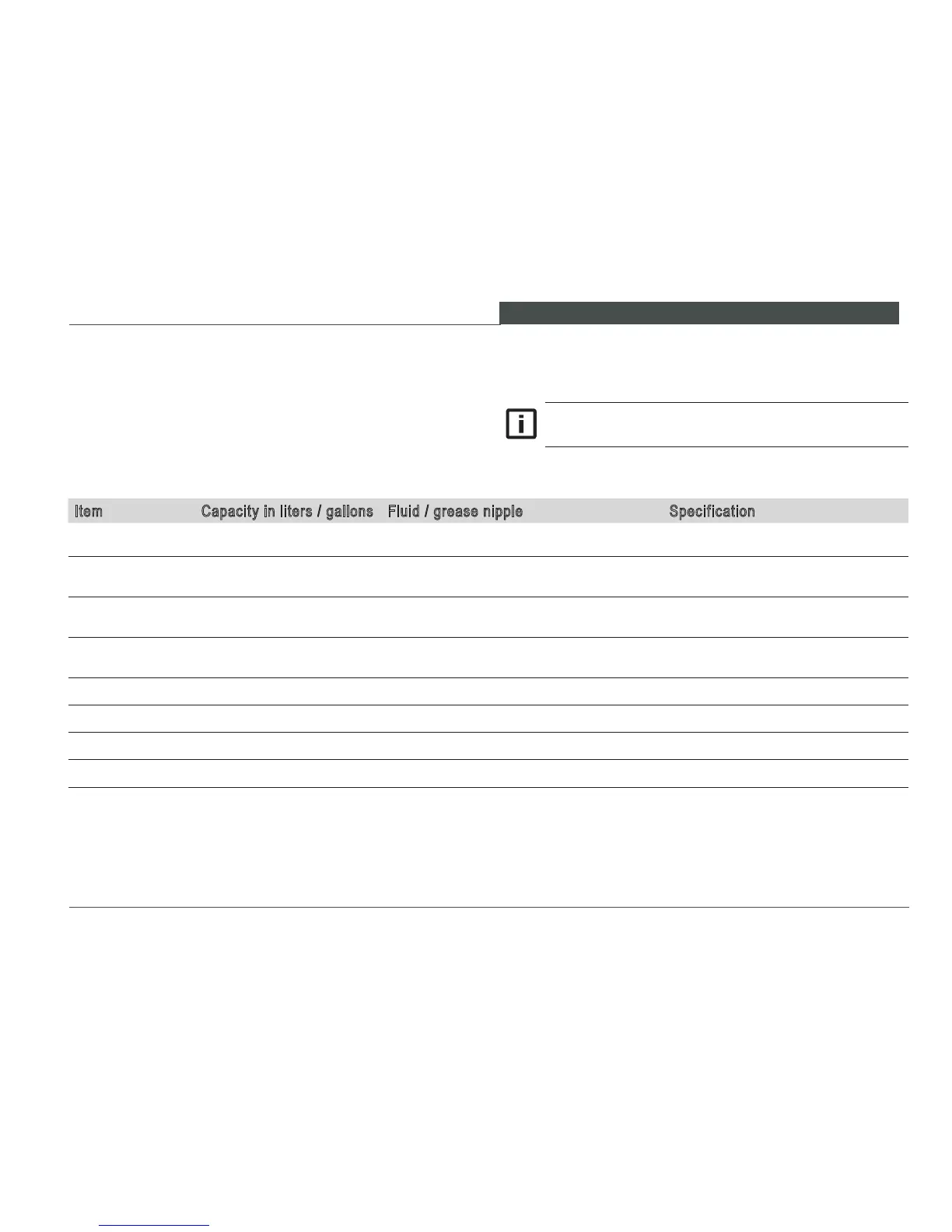 Item Capacity in liters / gallons Fluid / grease nipple Specification