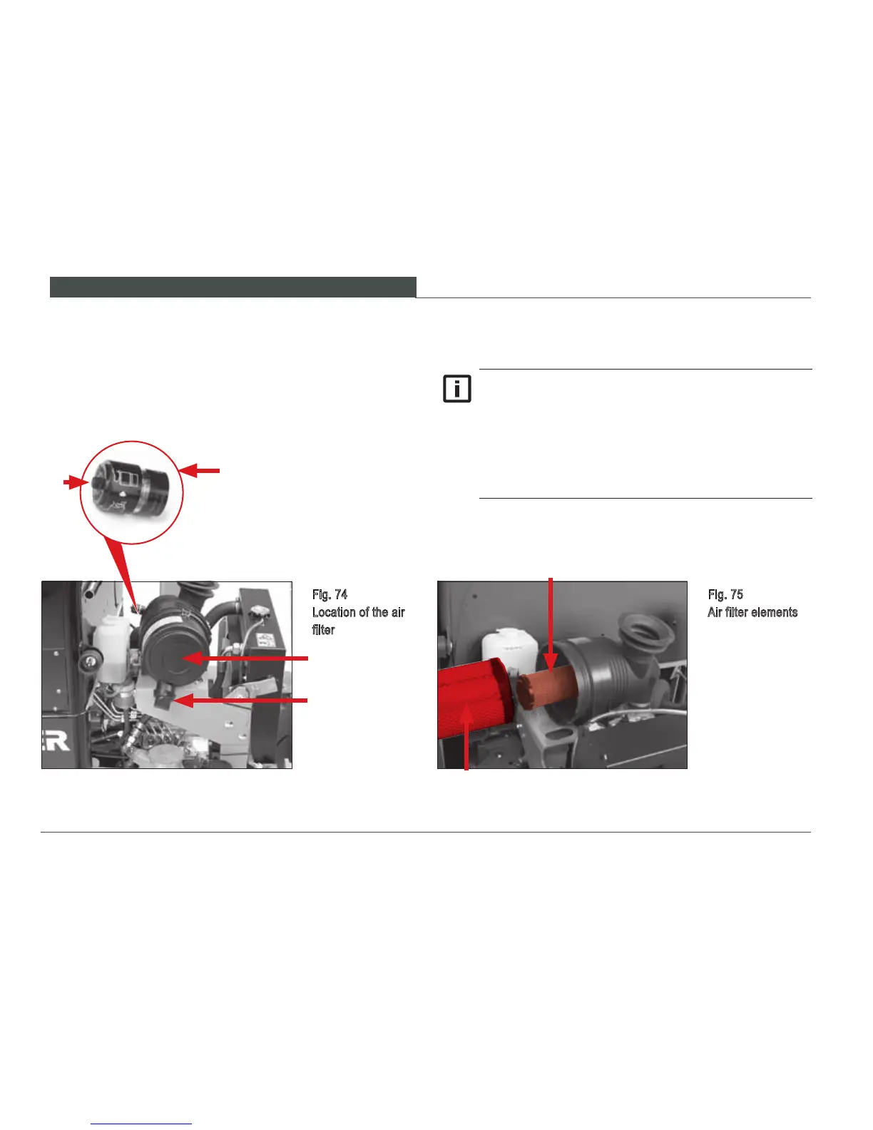 Check if the outlet slot on the dust valve Item 1 (Fig. 74)