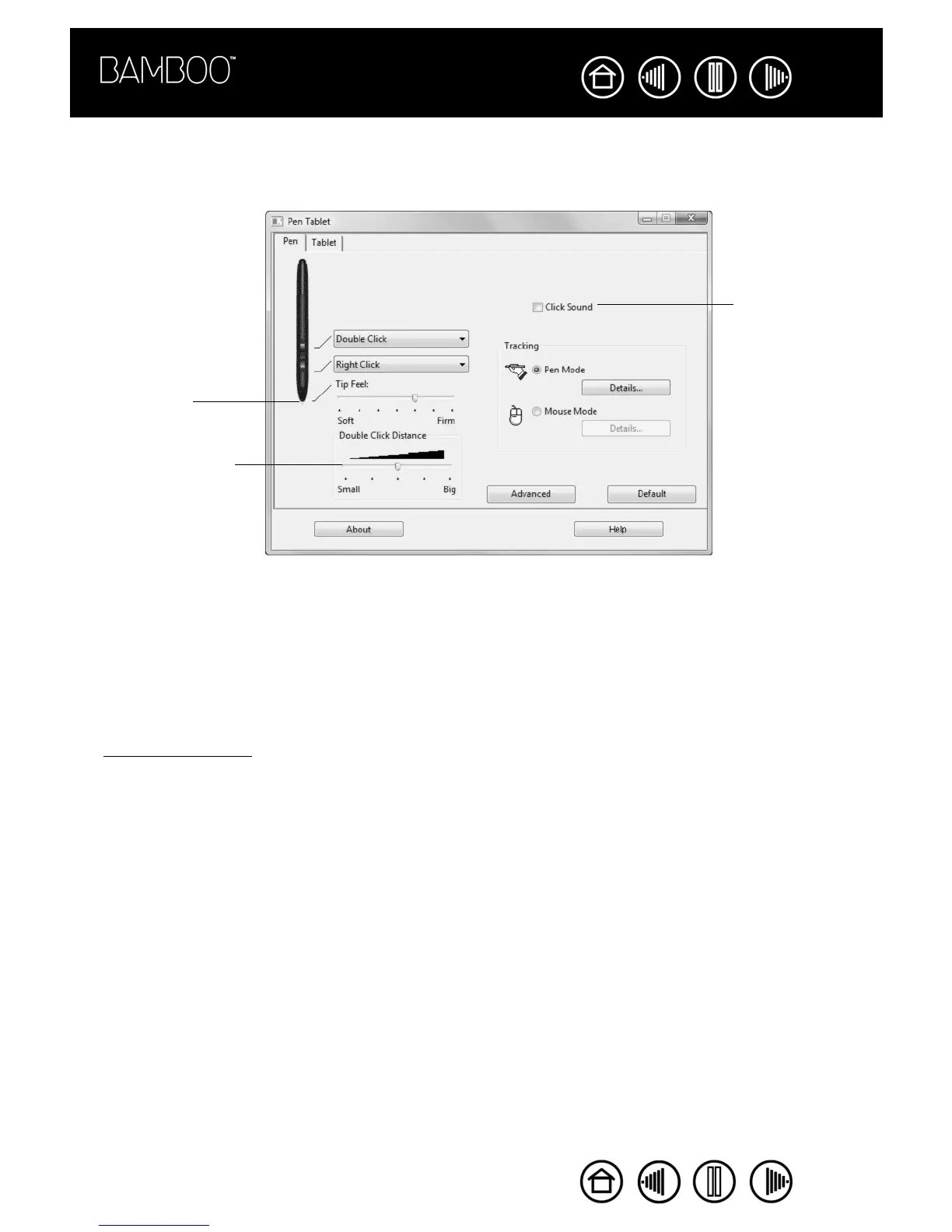 To adjust the tip sensitivity of your Bamboo pen, select the PEN tab. To create broad inking strokes or to click