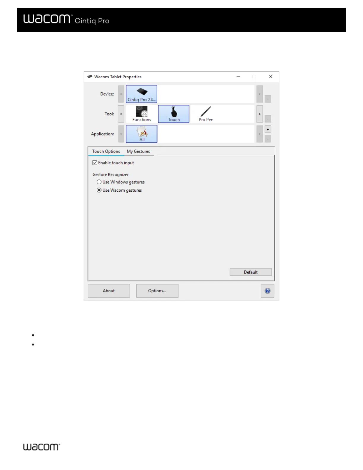 My Gestures tab. From the Touch Options tab, select the Use Wacom Gestures option.